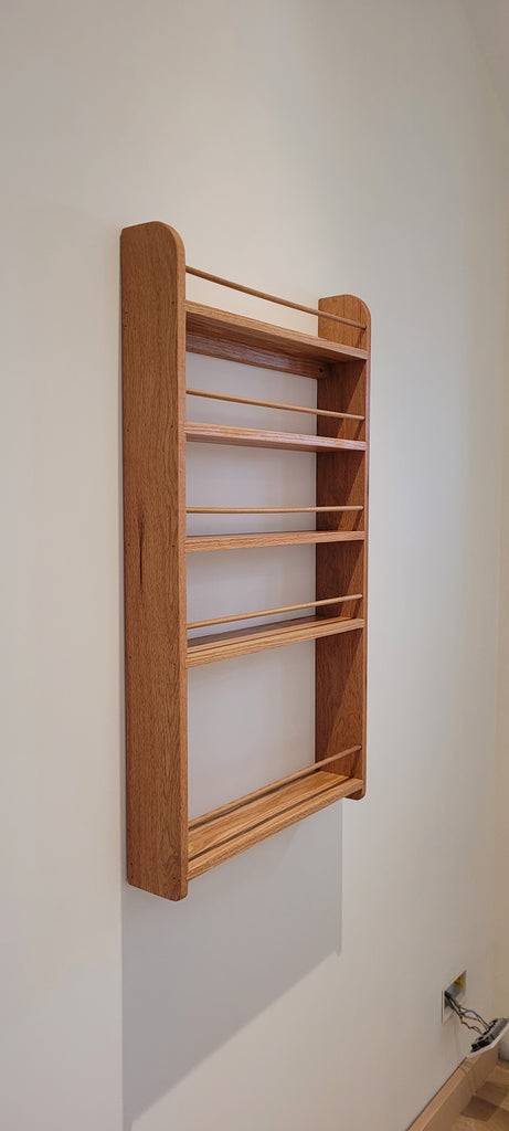 Handmade to order in our Lincolnshire, UK workshop. Designed with a tall bottle shelf for oils, vinegars and sauces, along with additional shelves for spices, herbs and other condiments. Bottles and jars are secured by hardwood rails to keep items securely in place. Install with included fixings.